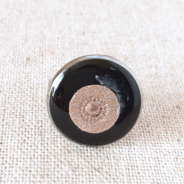 - Ronds de cuir de vachette non concentriques, noir brillant et moucheté cuivré, ce dernier ayant été martelé avec un motif soleil.