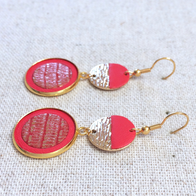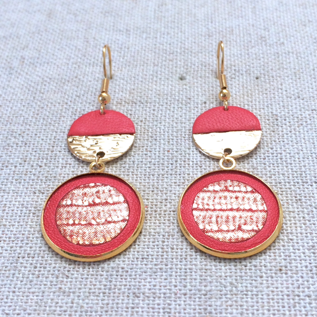 Boucles d'oreilles « Adagio » dorées, cuir corail et corail à motifs dorés