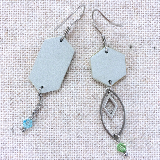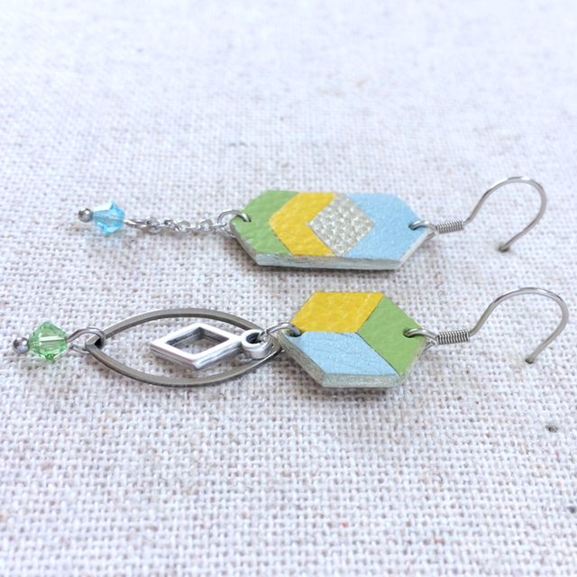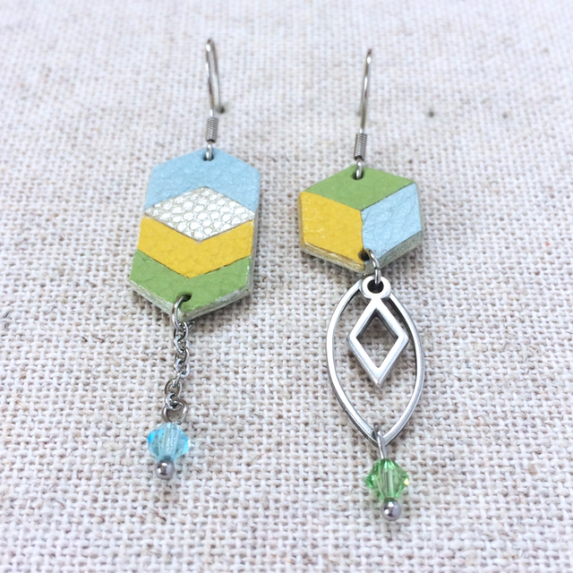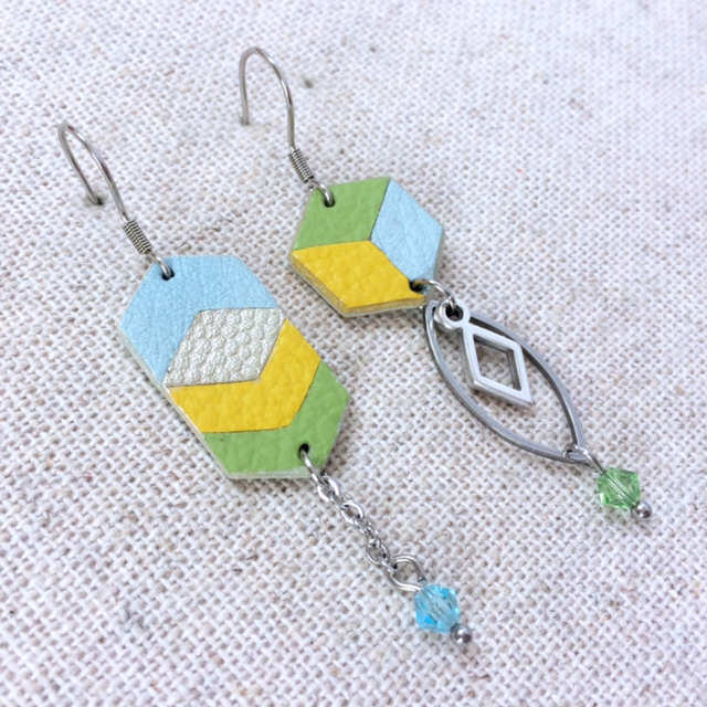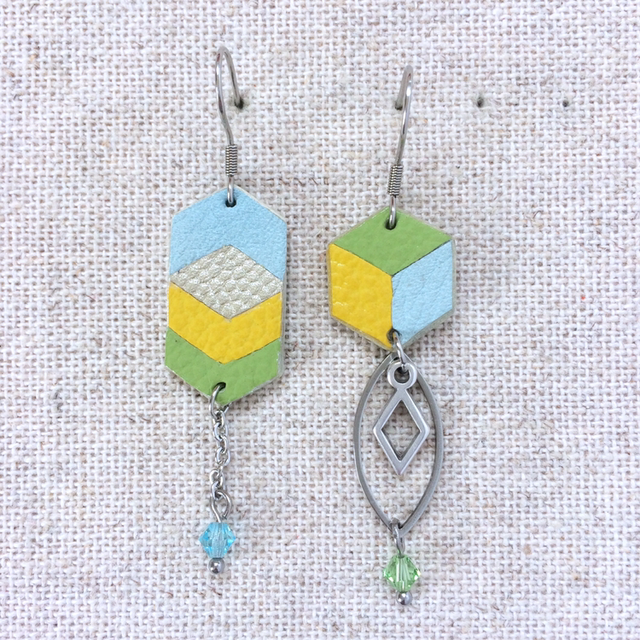 Boucles d’oreilles « Arioso » asymétriques, argentées, cuir bleu pastel, champagne, jaune et vert pomme