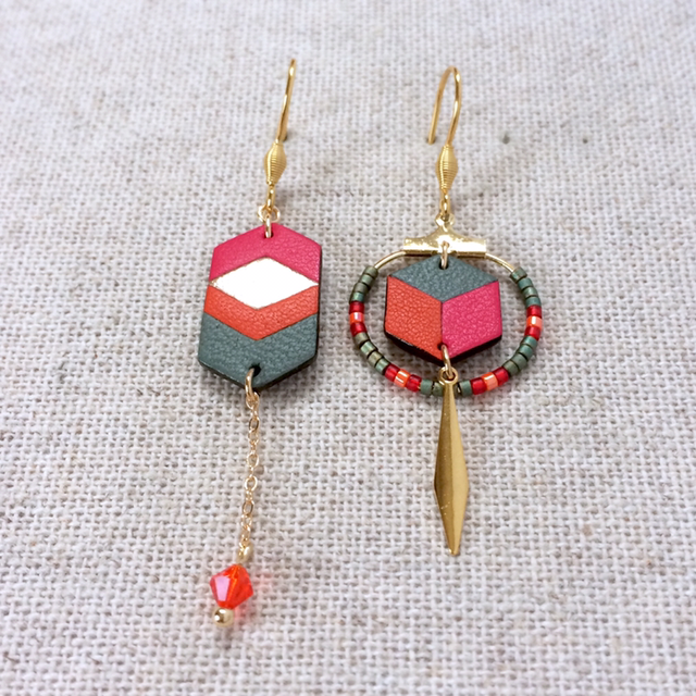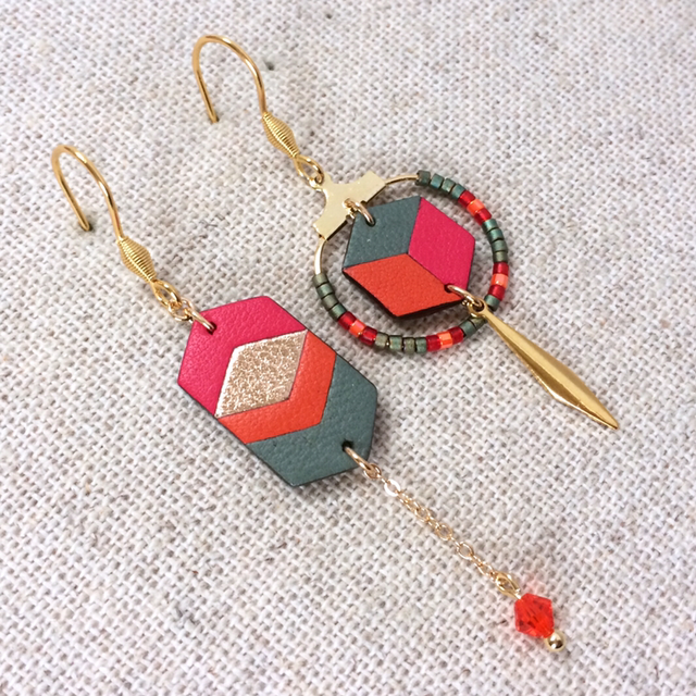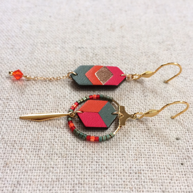 Boucles d’oreilles « Arioso » asymétriques, dorées, cuir rose camélia, cuivré, orange vif et vert bronze