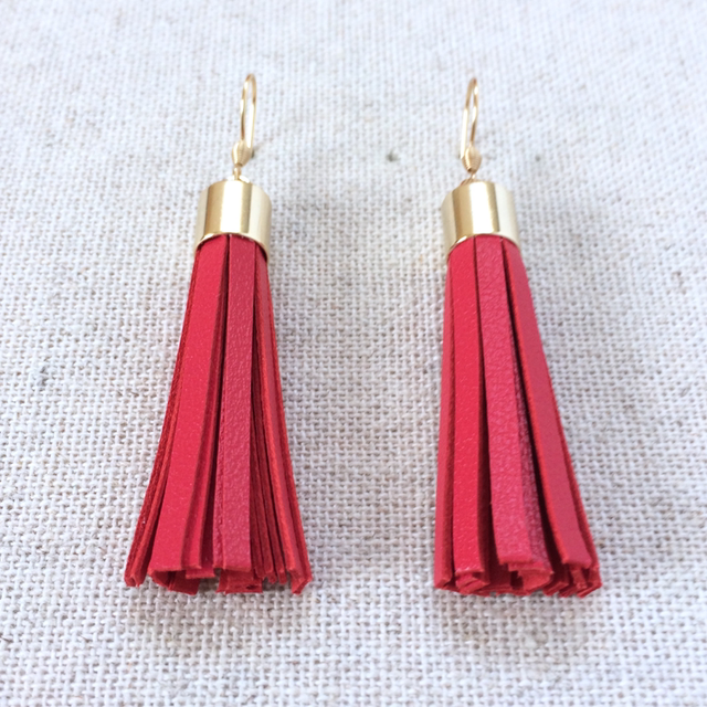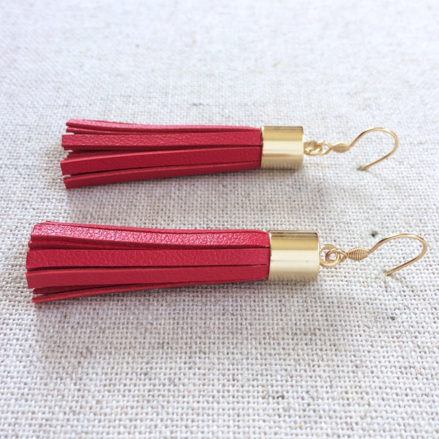- Pompon de cuir de chèvre rouge cerise, découpé à la main.
