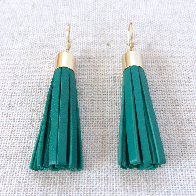 - Pompon de cuir d’agneau vert émeraude, découpé à la main.