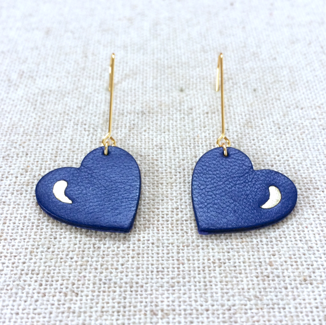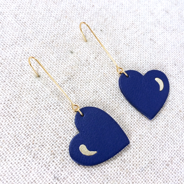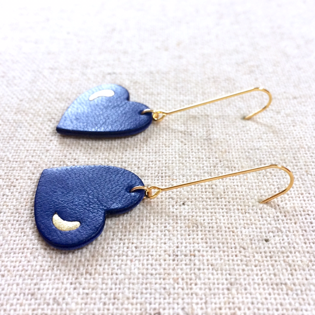 - Pièce de cuir d’agneau bleu Roy, en forme de cœur, doublé et marqueté au recto d’une petite goutte de cuir de chèvre doré.
