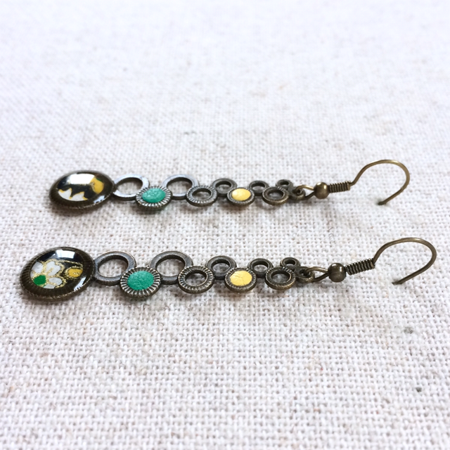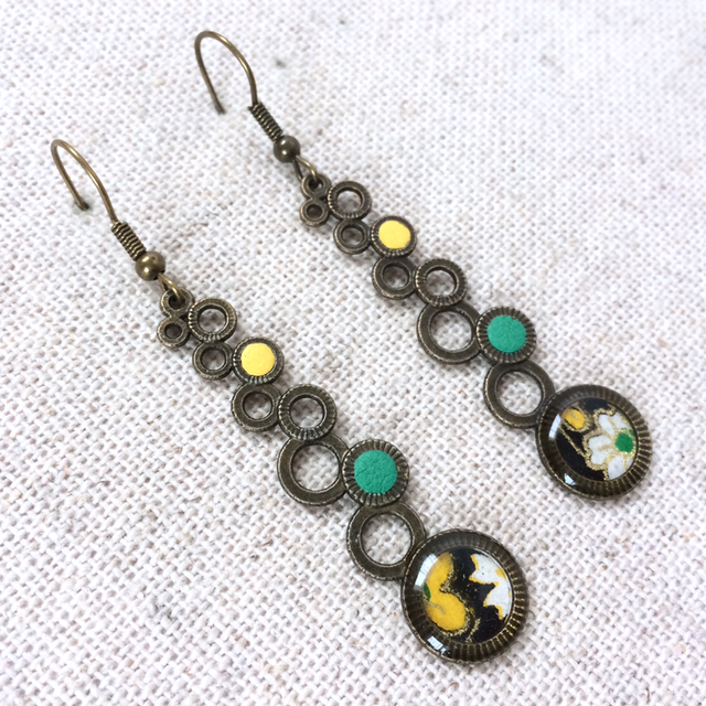 - Connecteur à cercles bronze avec rond de papier washi, recouvert de résine, à la base, et 2 trous garnis de cuir d’agneau jaune et vert.