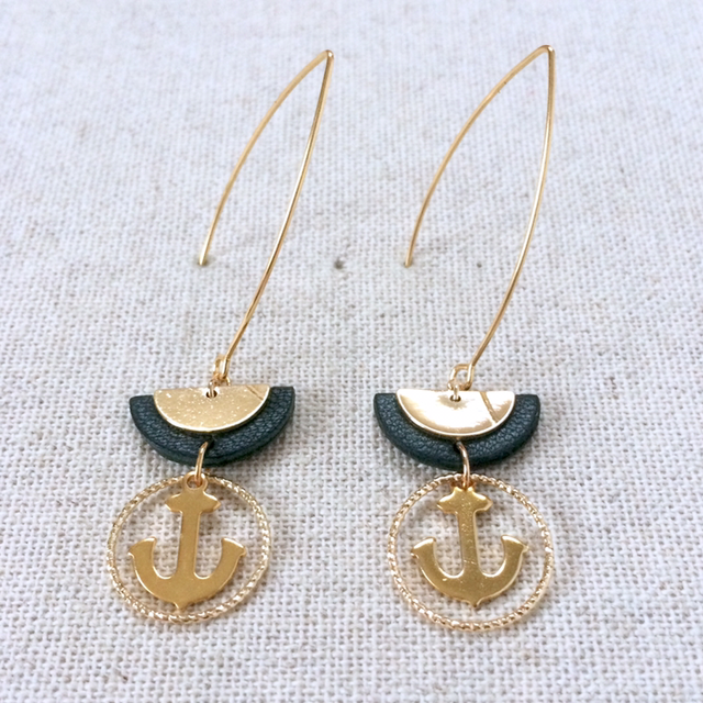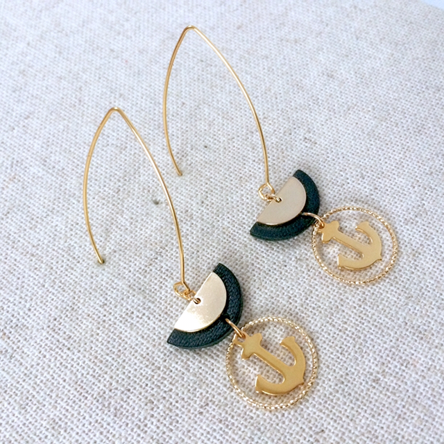 Boucles d’oreilles « Coda » dorées, cuir vert sombre