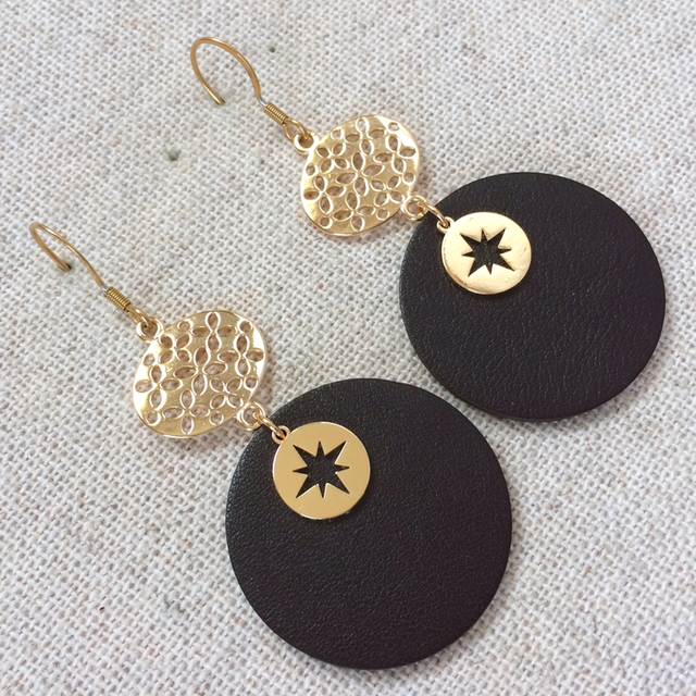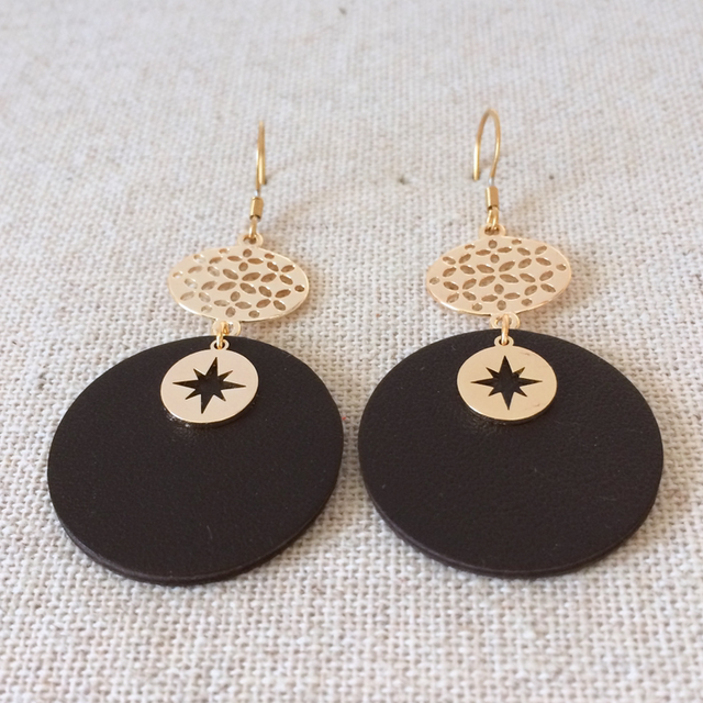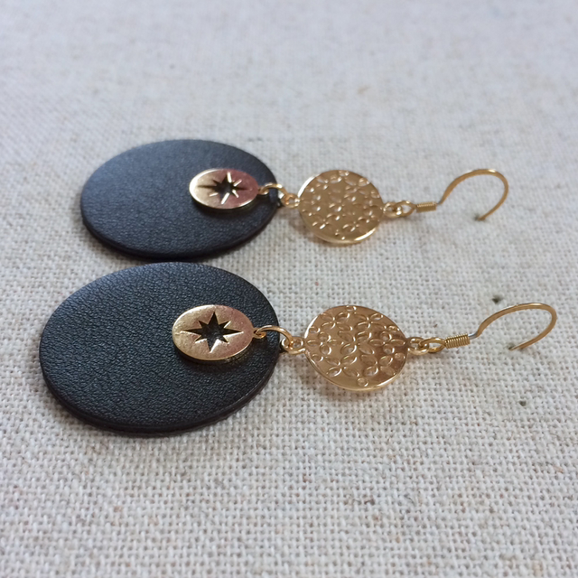 - Rond de cuir d’agneau doublé (30 mm de diamètre), couleur brune et breloque plaquée or étoile du nord en creux.