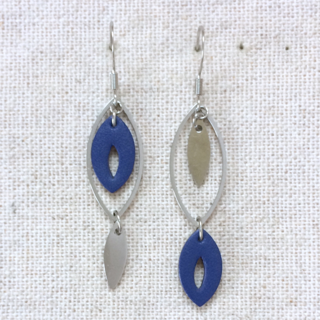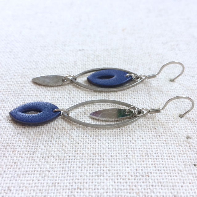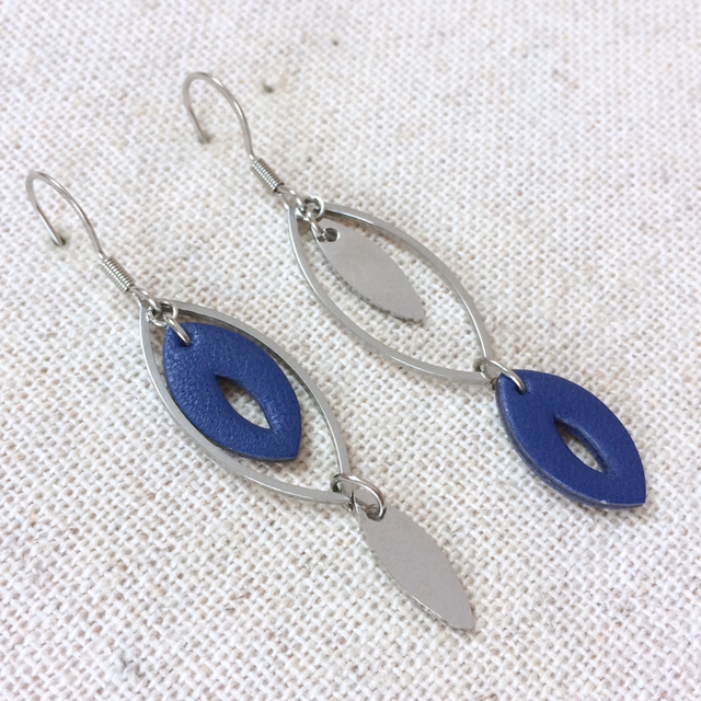 Boucles d’oreilles « Contrepoint » argentées, cuir bleu indigo