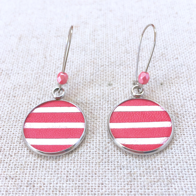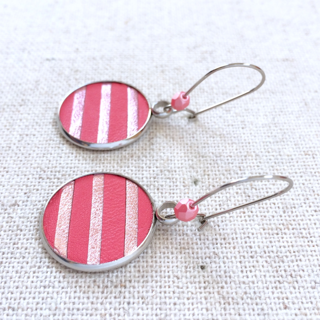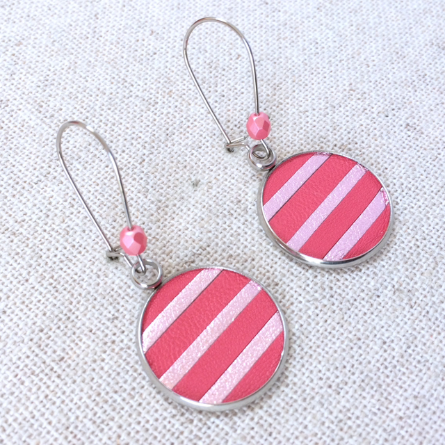 Boucles d’oreilles cuir marinière rose et rose pâle métallisé
