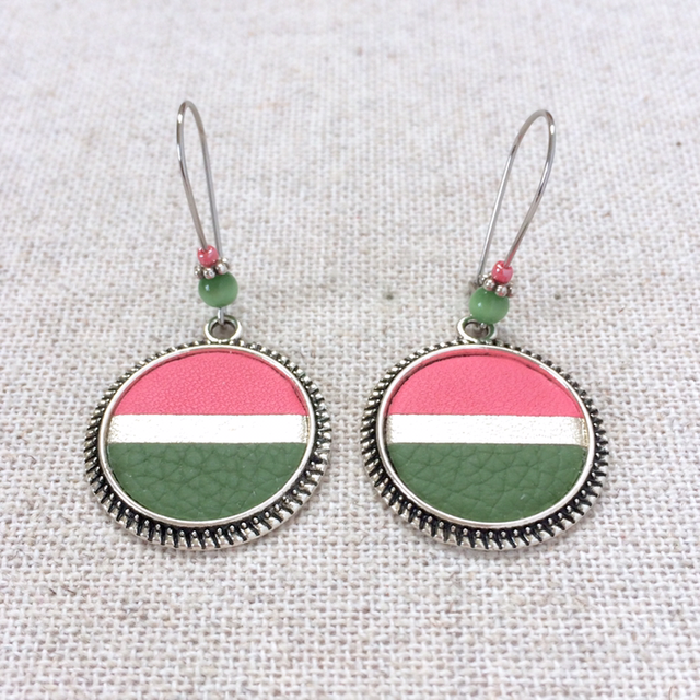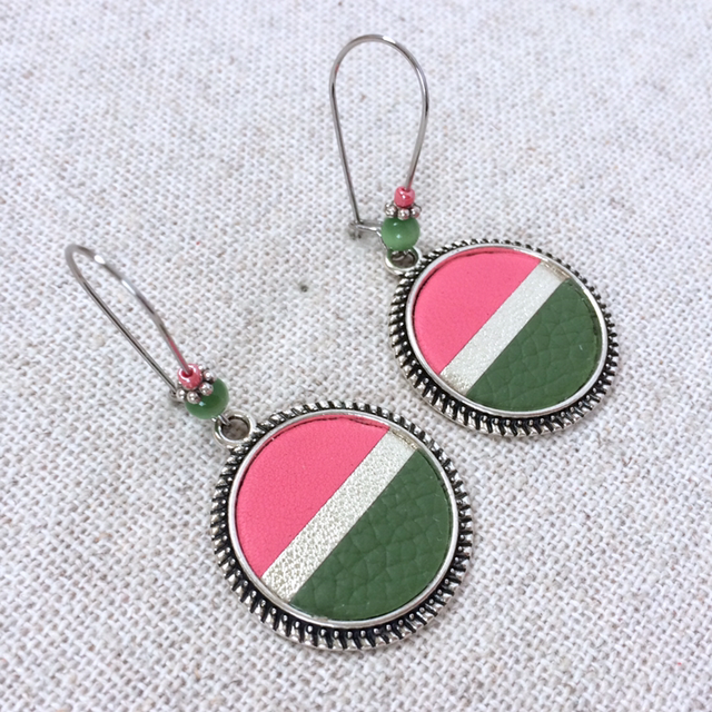 Boucles d’oreilles « Demi-cadence » argentées, cuir rose, champagne et vert