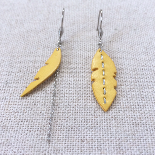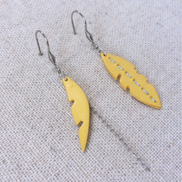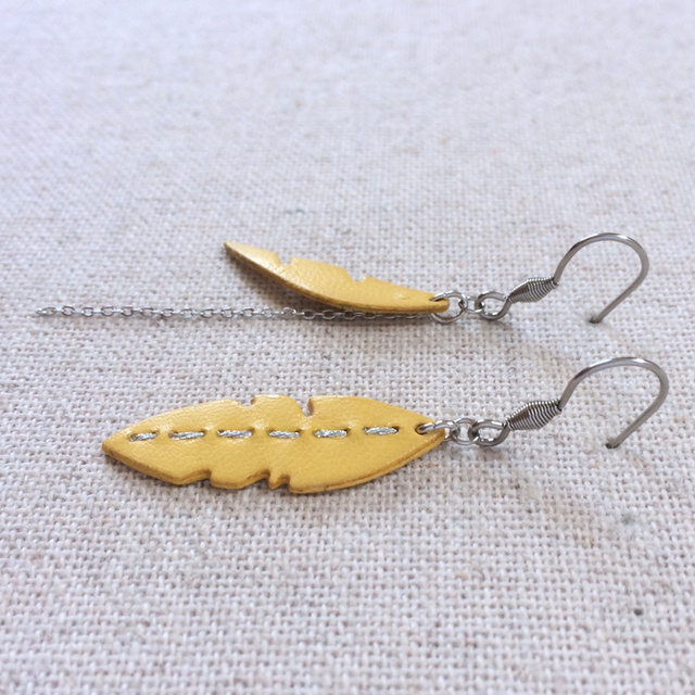 - Pièce de cuir d’agneau doublée, couleur jaune, de forme "plume courbe" avec chaînette en acier inoxydable.