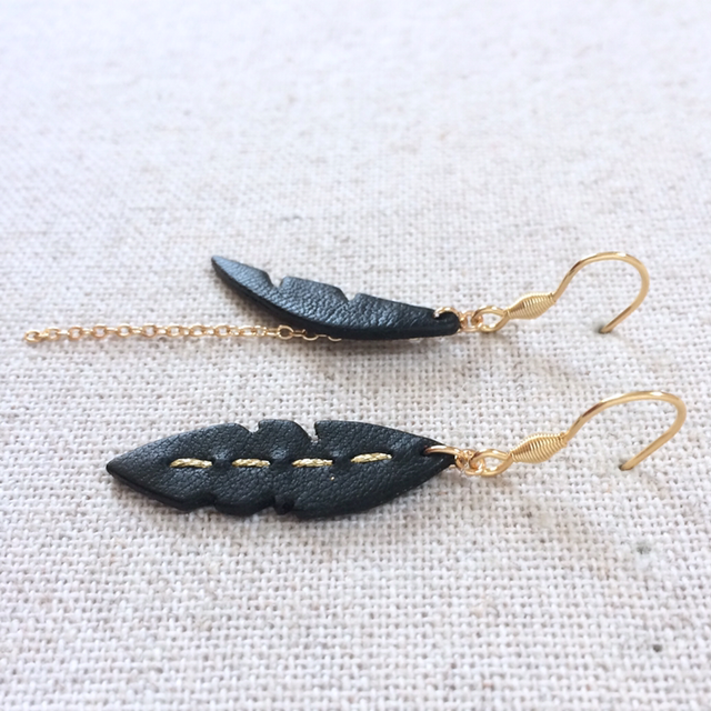 - Pièce de cuir d’agneau doublée, de couleur noire, de forme "plume courbe" avec chaînette plaquée or.