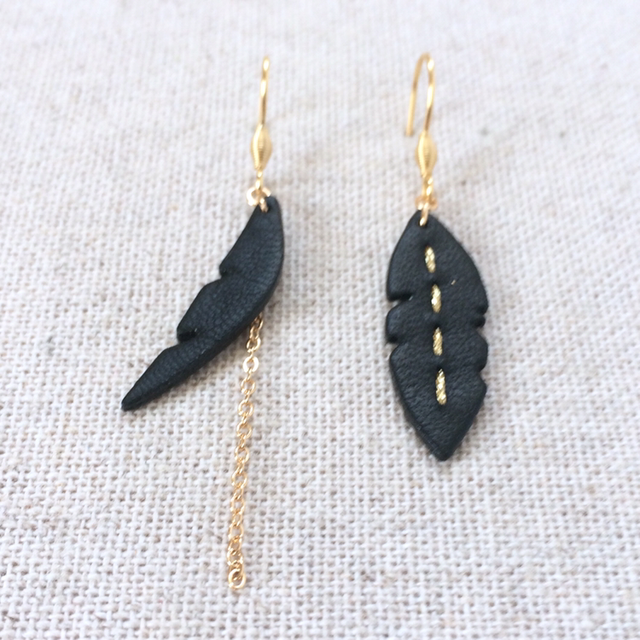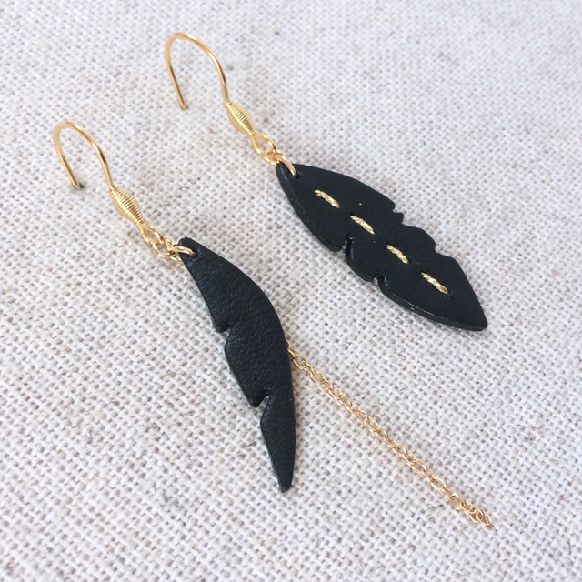 Boucles d’oreilles « Dolce » dorées, asymétriques, cuir noir