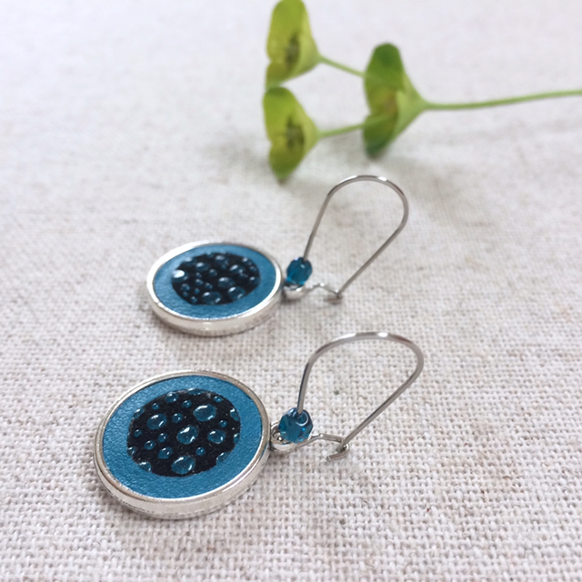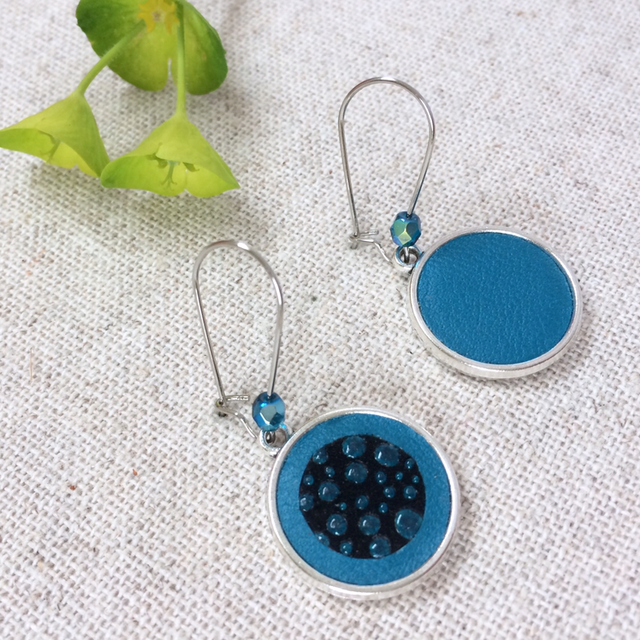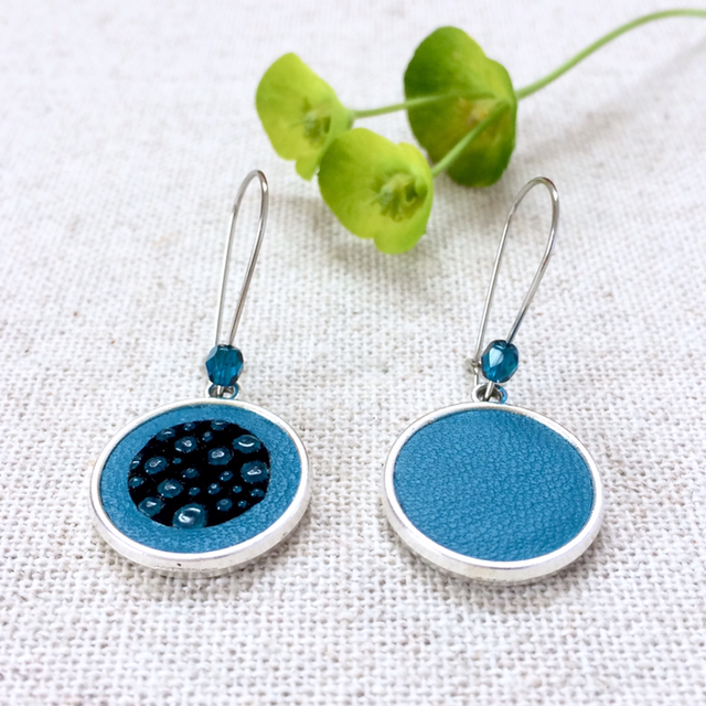 Boucles d’oreilles « Duo » argentées, réversibles, cuir bleu canard/ Noir à pois bleus