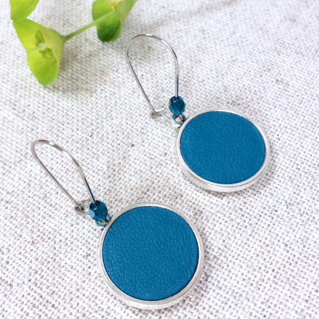 Support de cabochon argenté double face avec d’un côté du cuir d’agneau bleu canard uni et de l’autre un rond de cuir noir à pois bleu canard en relief cerclé d’un anneau de cuir bleu canard.