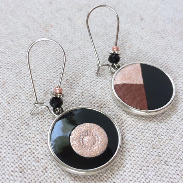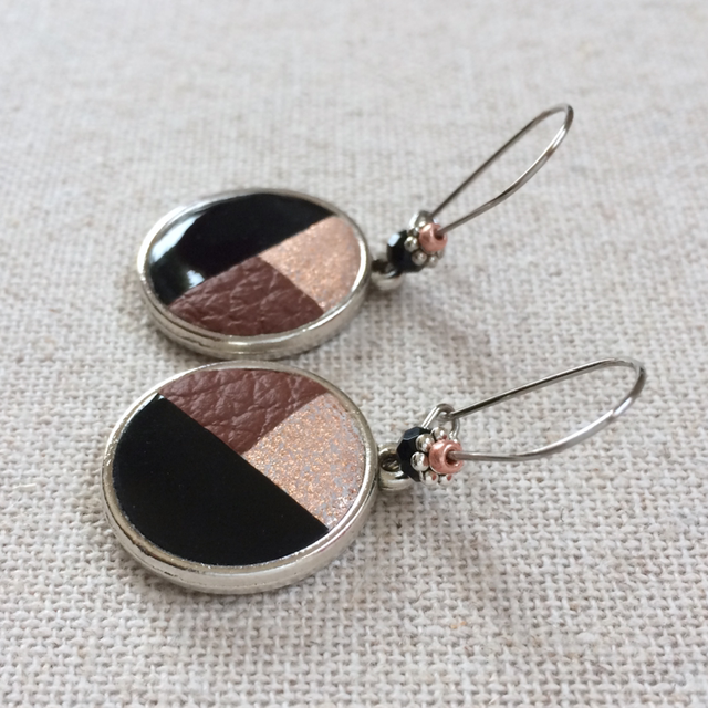 Boucles d’oreilles « Duo » réversibles, argentées, cuir noir brillant, moucheté cuivré et chocolat