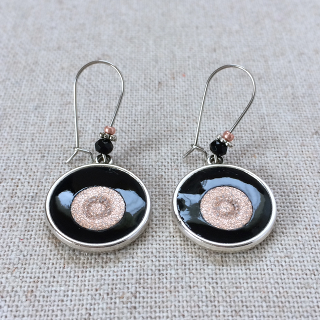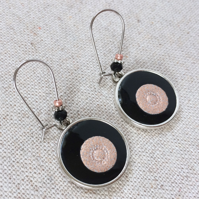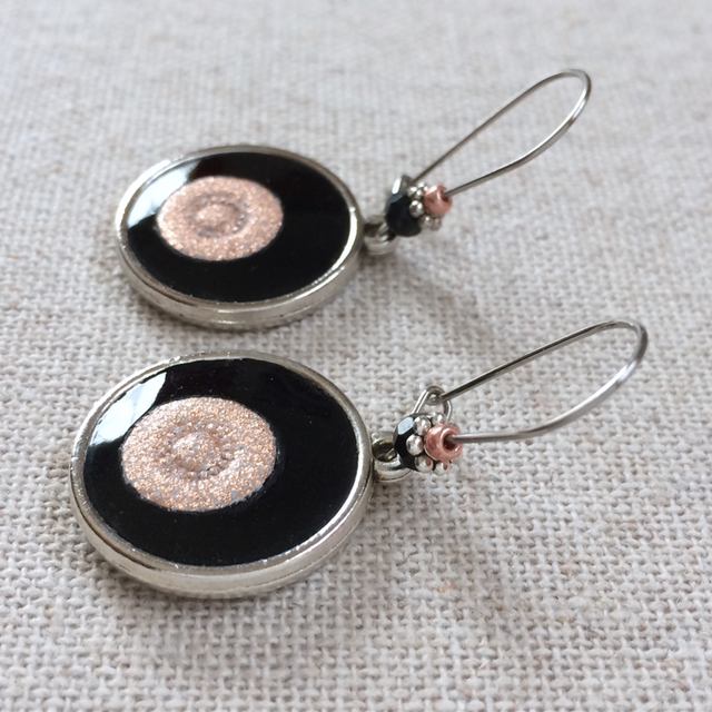 - Perle donut noire à facettes de bohème, intercalaire fleur argentée et perle de rocaille cuivrée, glissées sur la dormeuse.