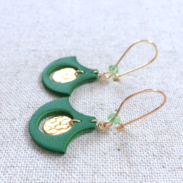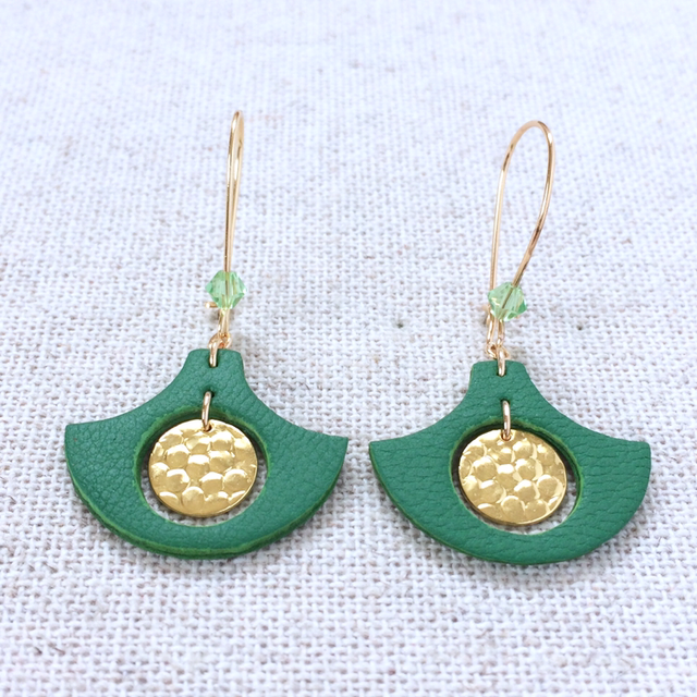 Boucles d’oreilles « Fioritura » dorées, cuir vert gazon
