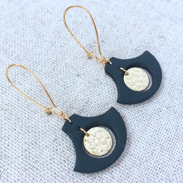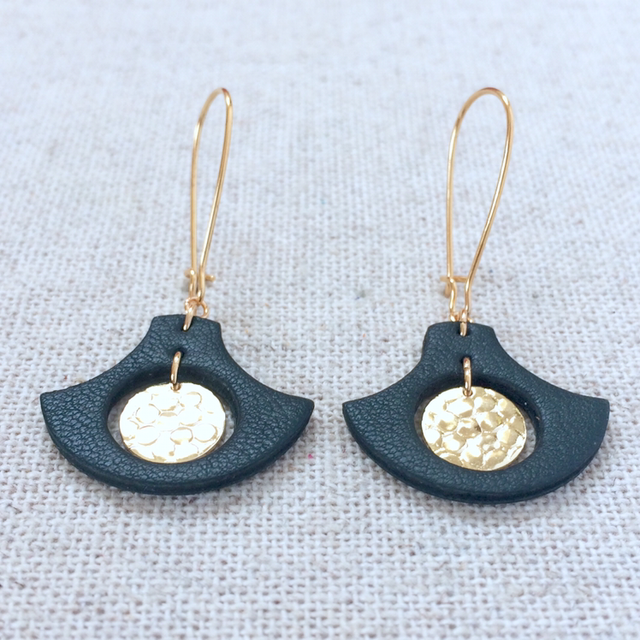 Boucles d’oreilles « Fioritura » dorées, cuir vert sombre