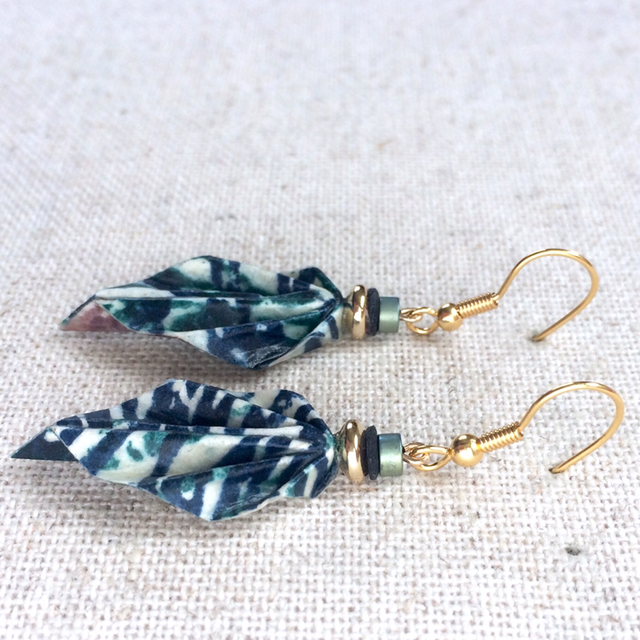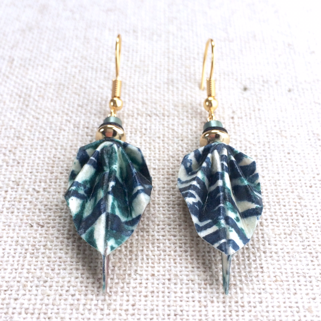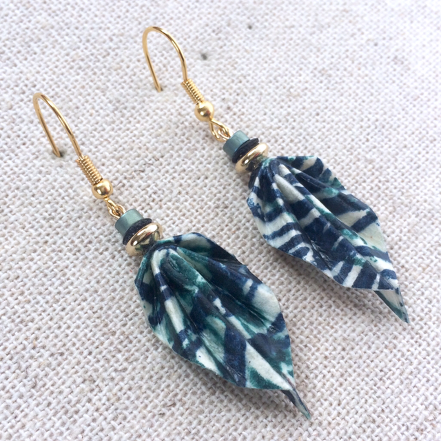 Boucles d’oreilles « Foriana » dorées, papier washi bleu et blanc
