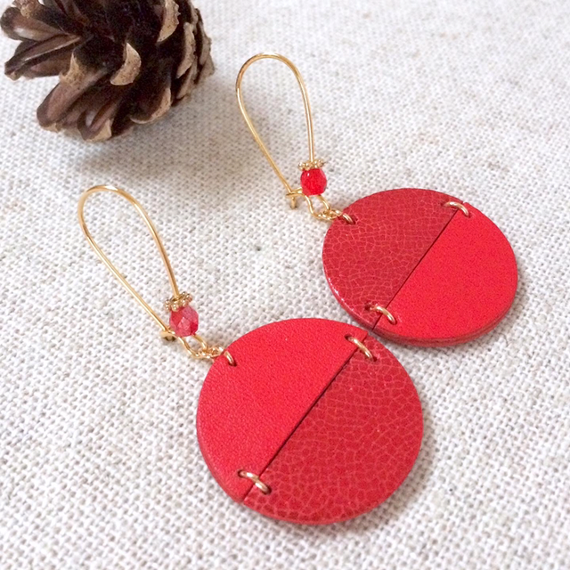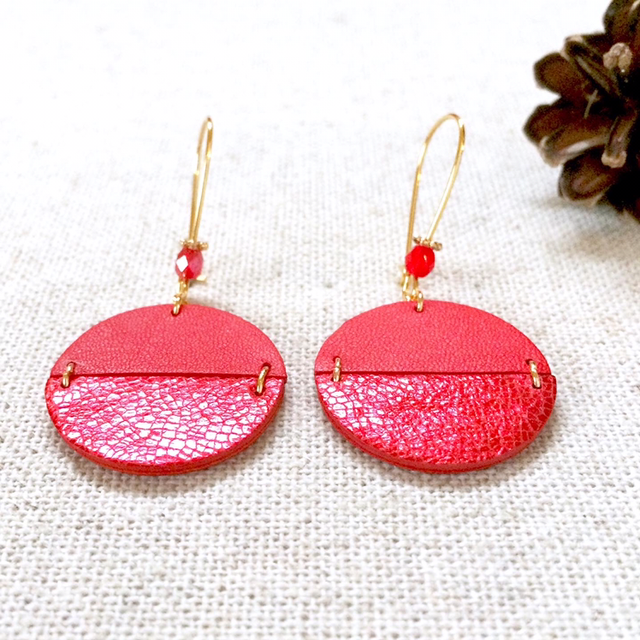 Boucles d’oreilles « Fortissimo » réversibles, dorées, cuir rouge pailleté et rouge coquelicot