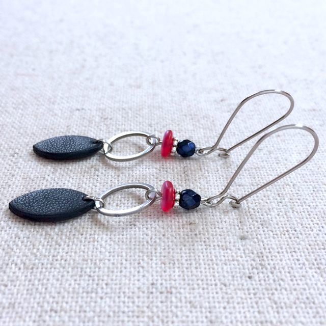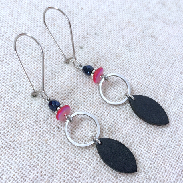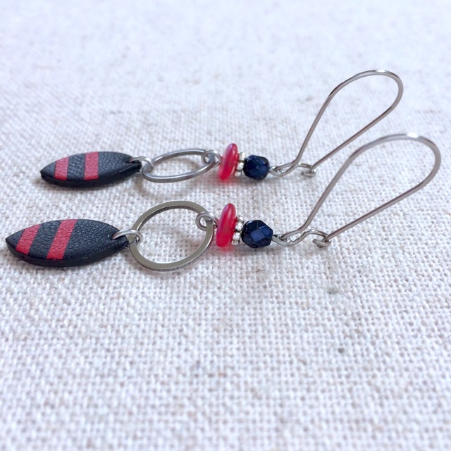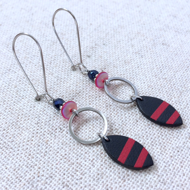 Boucles d’oreilles « Gavotte » argentées, réversibles, cuir façon marinière bleu très foncé et rouge/ cuir bleu très foncé