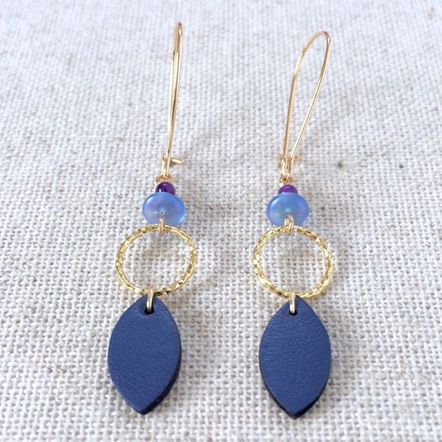 Boucles d’oreilles « Gavotte » réversibles, dorées, cuir violet métallisé / bleu indigo