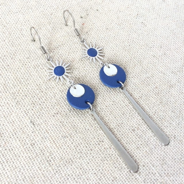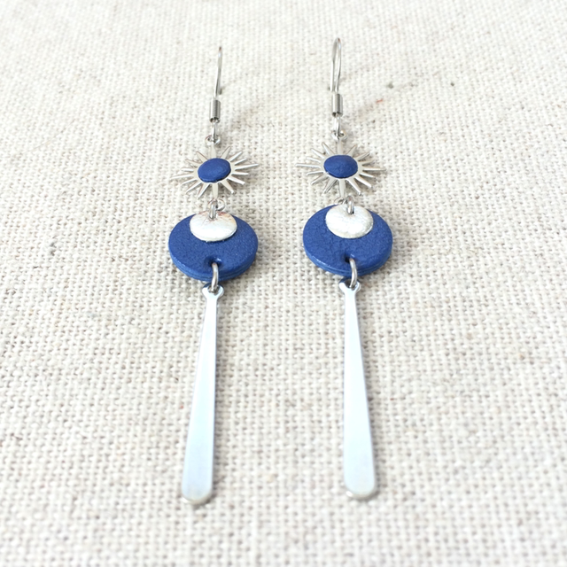 Boucles d’oreilles « Giocoso lungo » argentées, cuir bleu outremer