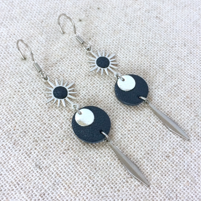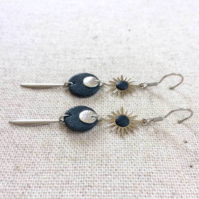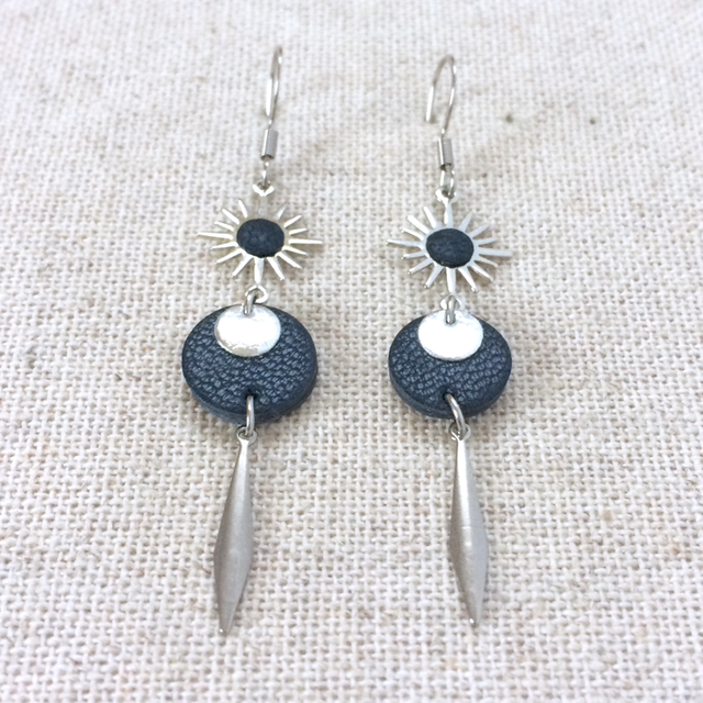 - Intercalaire « soleil » en laiton plaqué platine avec petit rond de cuir de chèvre couleur bleu gris foncé, collé au centre.