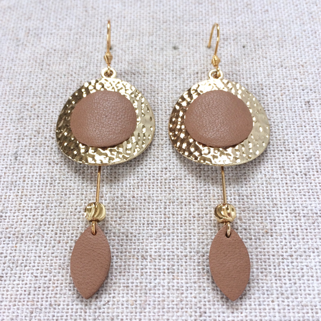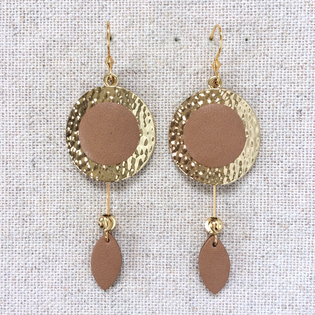 Boucles d’oreilles « Gong » dorées, cuir beige