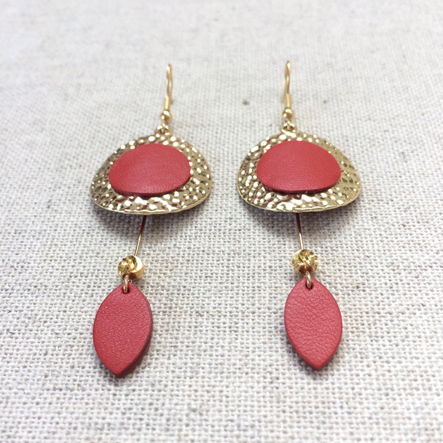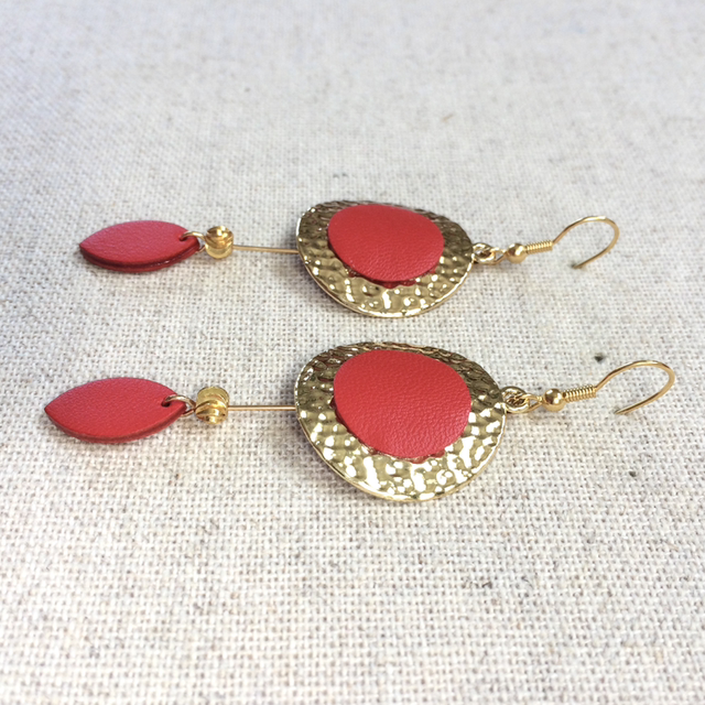 Boucles d’oreilles « Gong » dorées, cuir rouge coquelicot