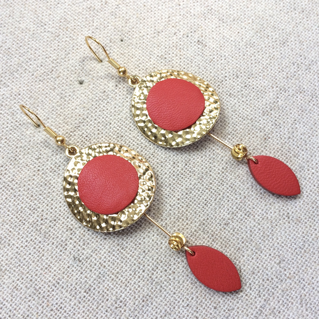 - Disque courbe et martelé doré (25 mm de diamètre) avec rond de cuir d’agneau rouge coquelicot (17 mm).