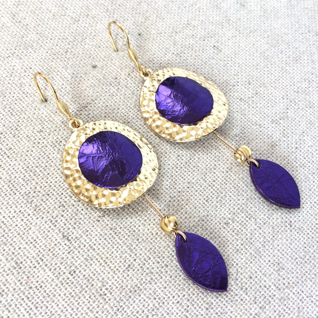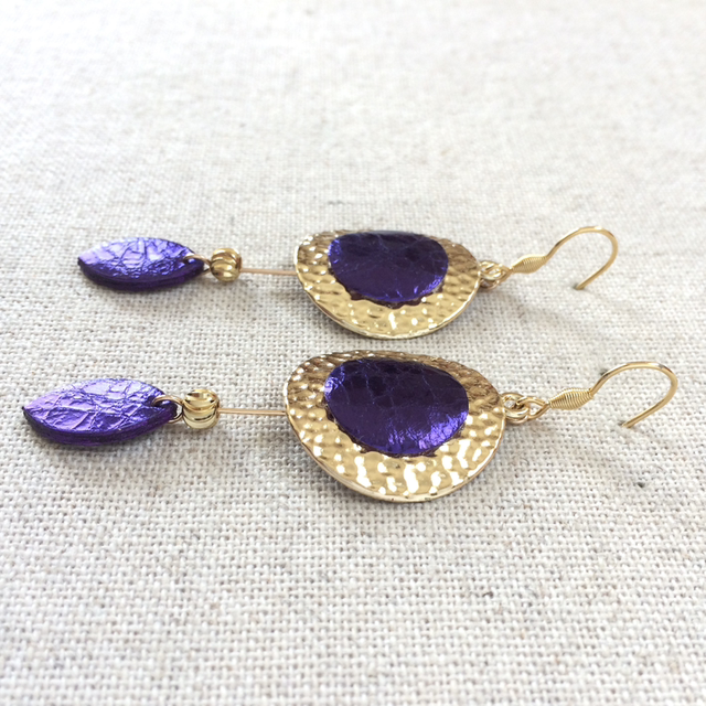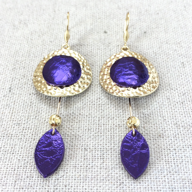 Boucles d’oreilles « Gong » dorées, cuir violet métallisé