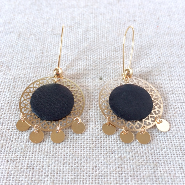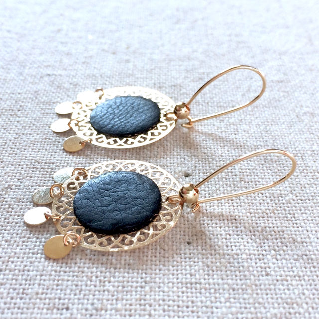 Boucles d’oreilles « Grelots » dorées, cuir bleu très foncé