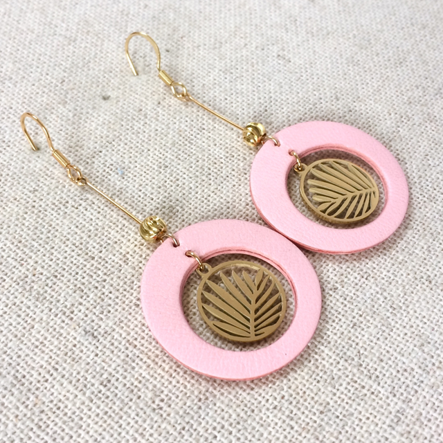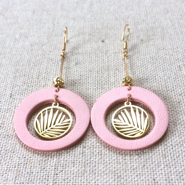 Boucles d’oreilles « Harmonie » dorées, cuir rose pâle