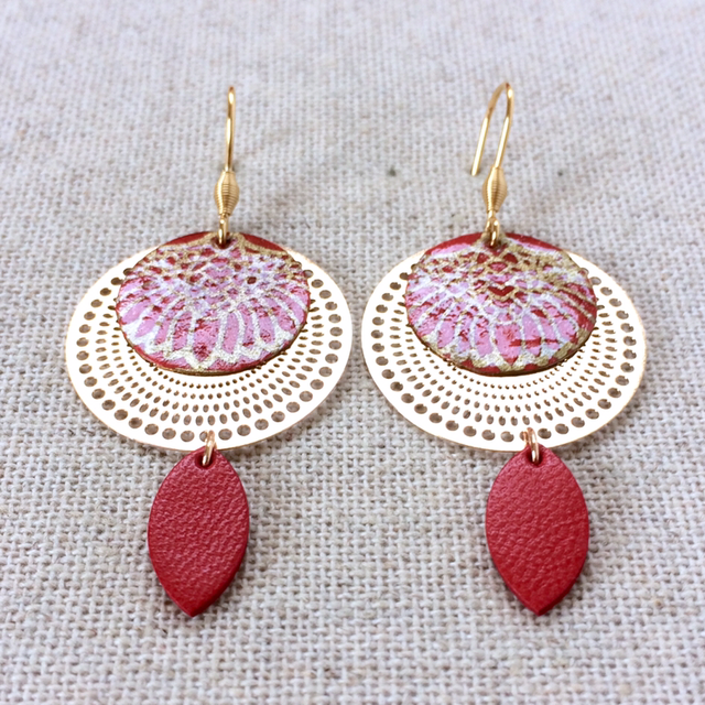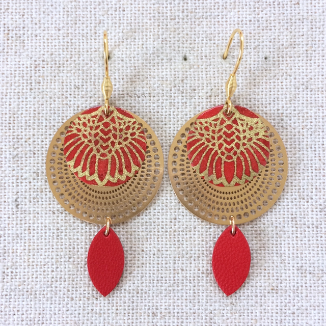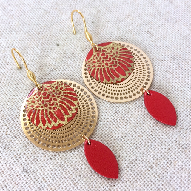 Boucles d’oreilles « Jota » dorées, papier washi graphique rouge et or, cuir rouge