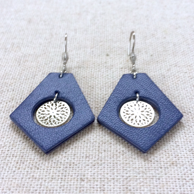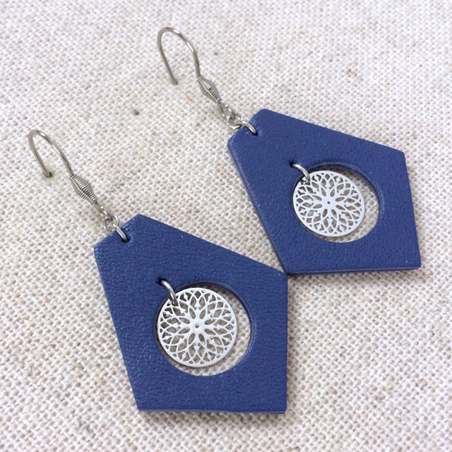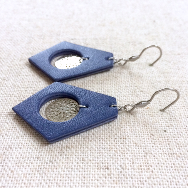 Boucles d’oreilles « Luth » argentées, cuir bleu indigo