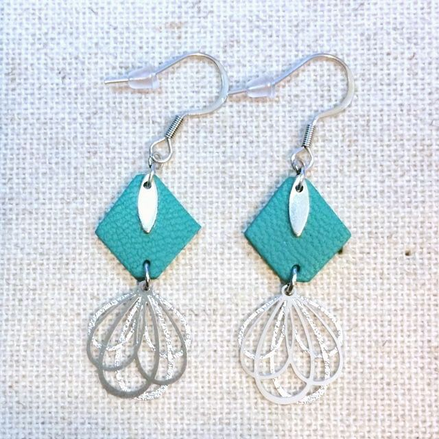 - Losange de cuir d’agneau, doublé, couleur vert Tiffanyet petite pampille de forme navette en laiton plaquée platine.