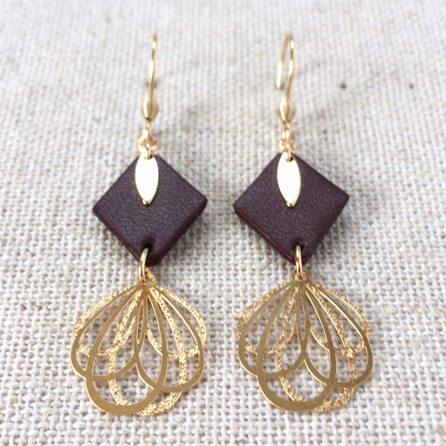 Boucles d’oreilles « Madrigal » dorées, cuir couleur châtaigne