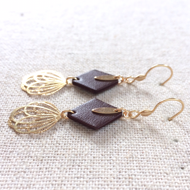- Losange de cuir d’agneau, doublé, couleur châtaigne et petite pampille de forme navette en laiton doré.