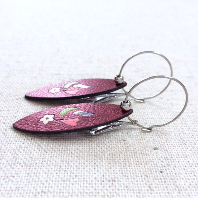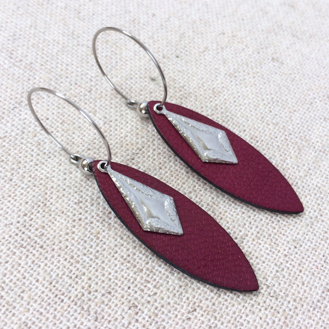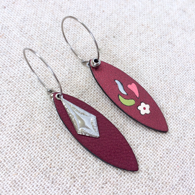 Boucles d’oreilles « Majeur » argentées, réversibles, cuir framboise marqueté et bordeaux