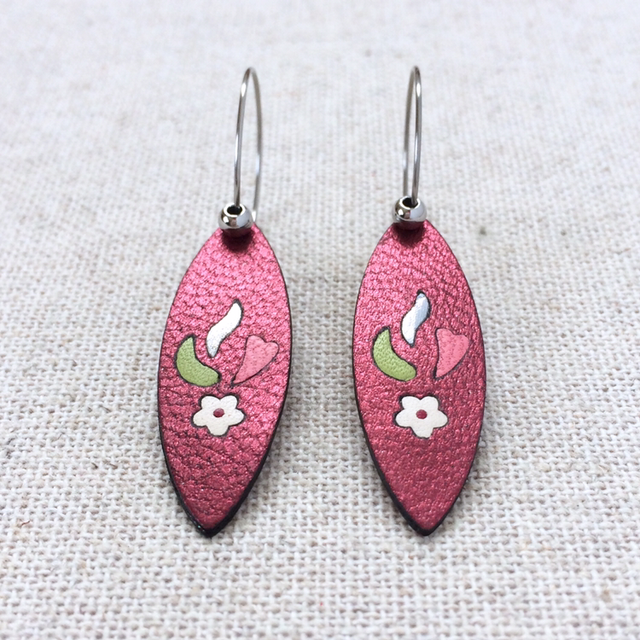 D’un côté - longue navette (4 x 1,3 cm) de cuir d’agneau framboise métallisé d’un côté avec marqueterie de cuir vert pomme, blanc cassé, rose et holographique + perle en acier inoxydable.