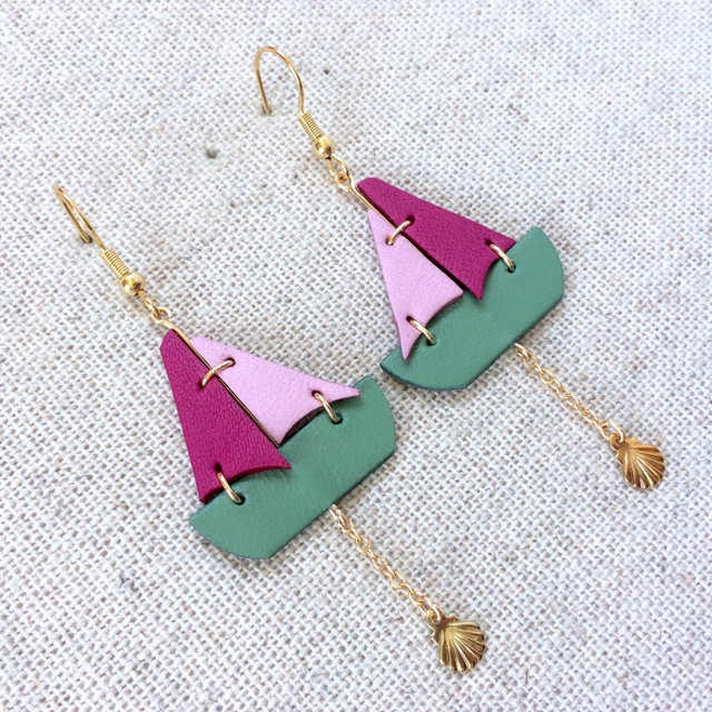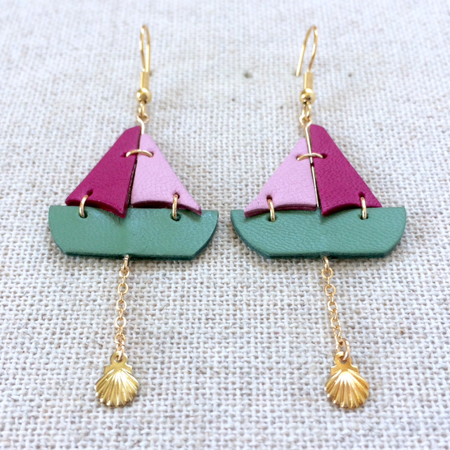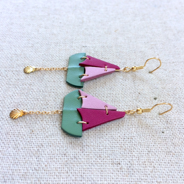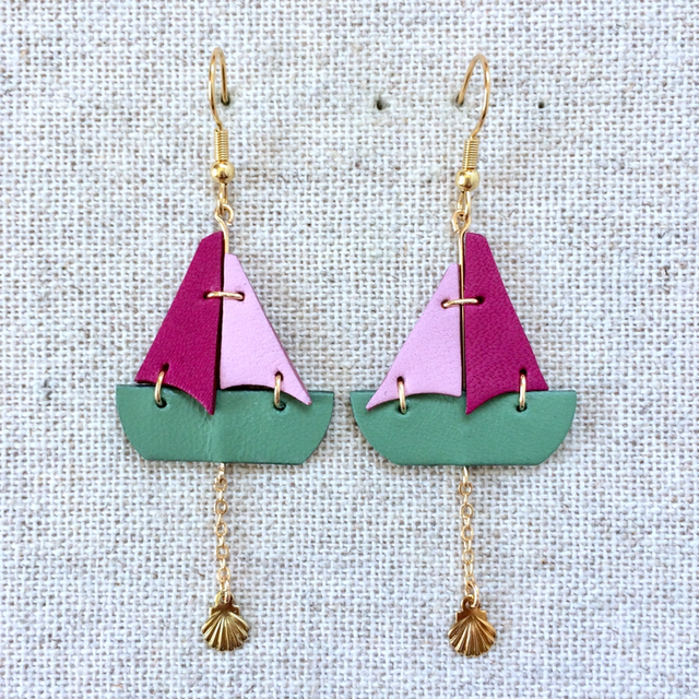 Boucles d’oreilles « Maman les p’tits bateaux » dorées, cuir vert lichen, violine et mauve