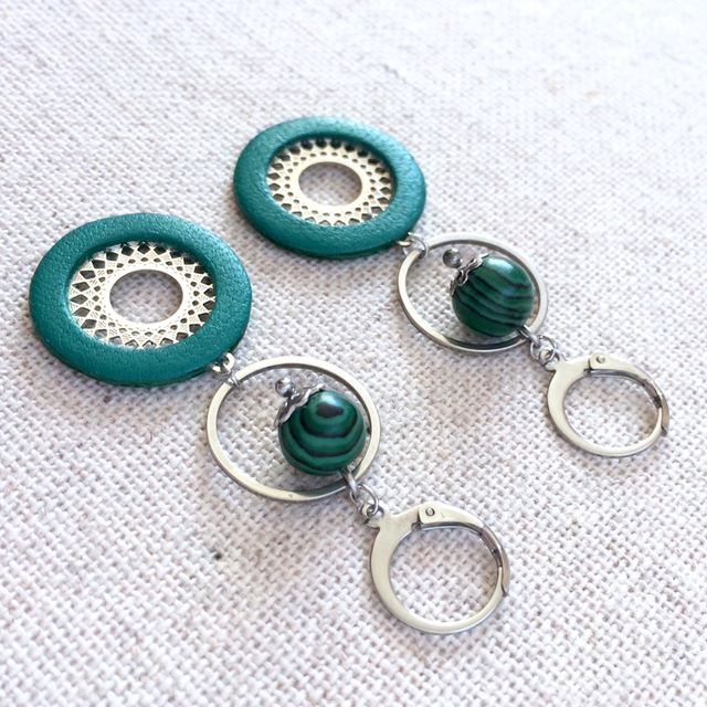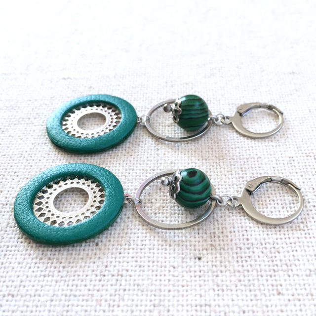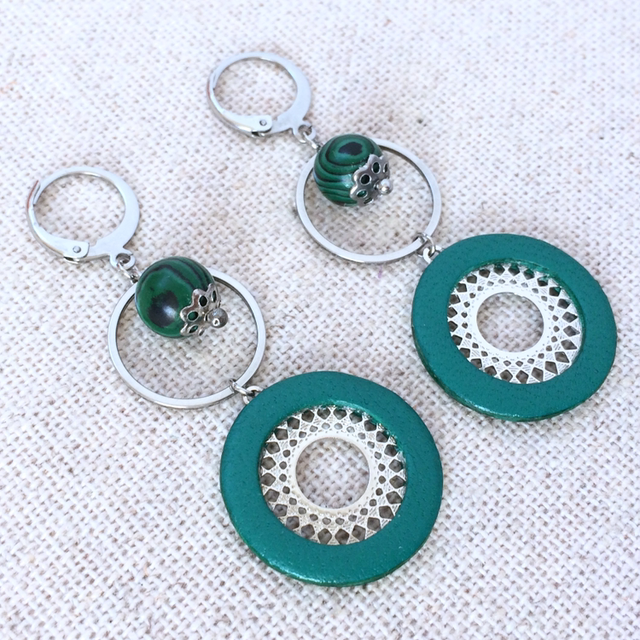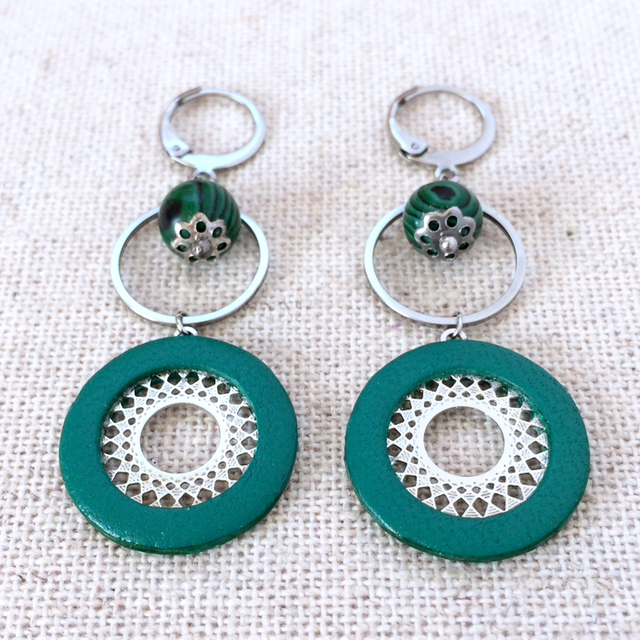 Boucles d’oreilles « Mandoline » argentées, cuir vert franc