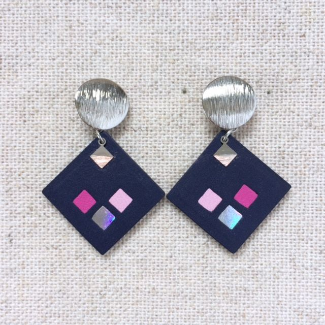 Boucles d’oreilles « Médiante » argentées, cuir bleu foncé, rose bonbon, holographique et mauve