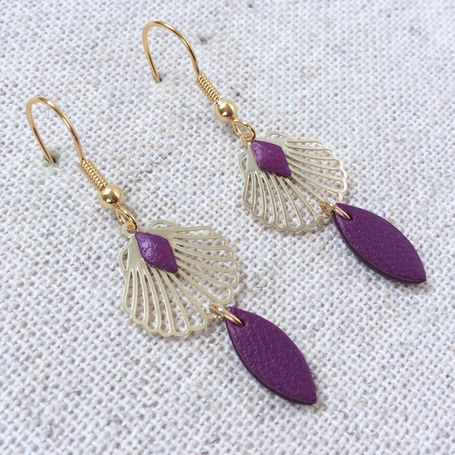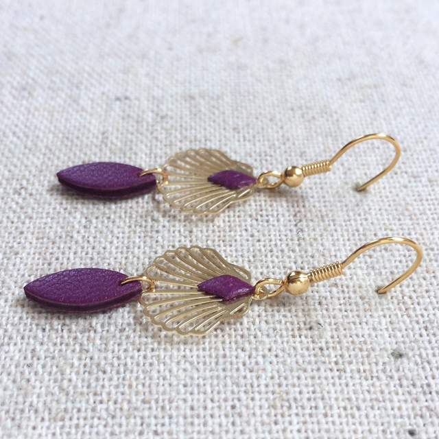 Boucles d’oreilles « Musette » dorées, cuir couleur lilas