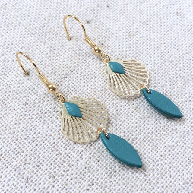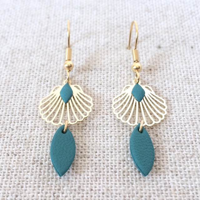 Boucles d’oreilles « Musette » dorées, cuir vert turquoise