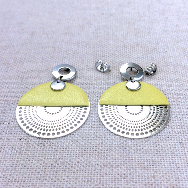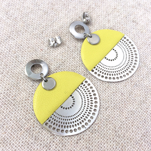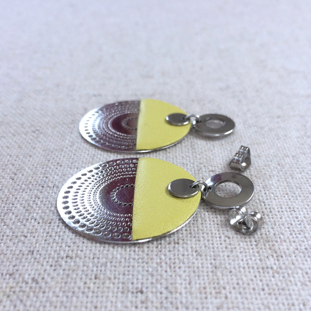 Boucles d’oreilles « Orchestre » argentées, cuir jaune citron