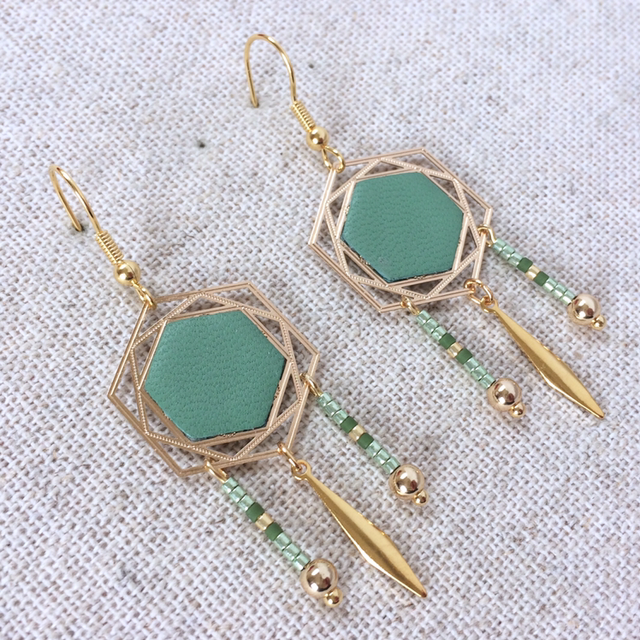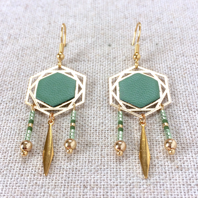 Boucles d’oreilles « Passacaille » dorées, cuir vert lichen et perles Miyuki assorties