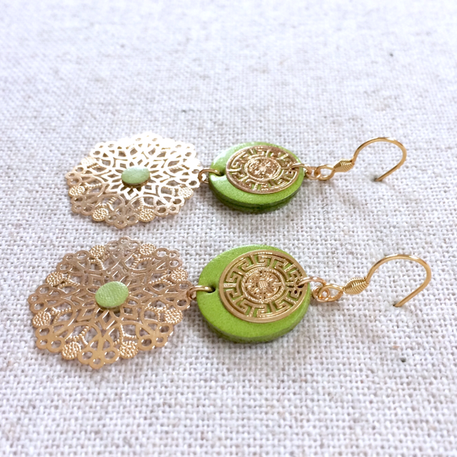 - Rond de cuir de vachette doublé (16 mm de diamètre), couleur vert pomme et estampe dorée de style japonisant.