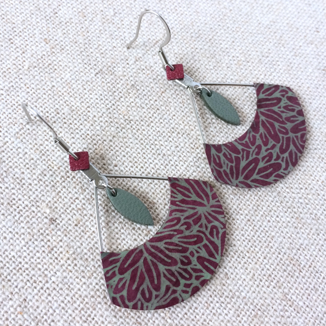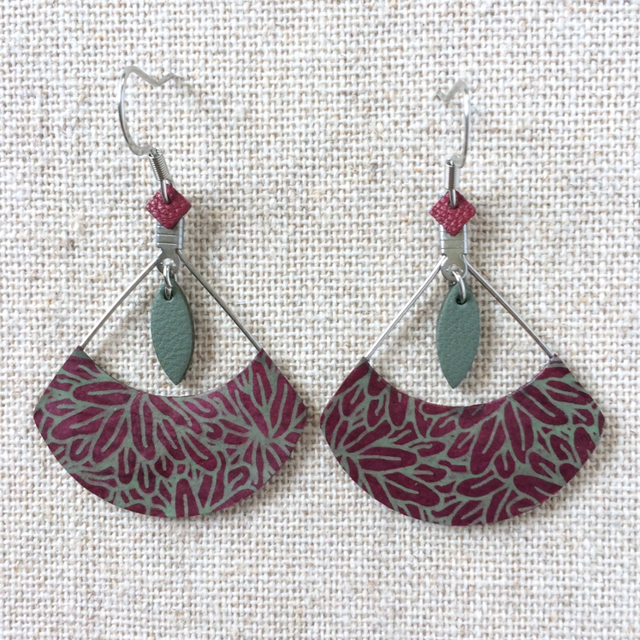 Boucles d’oreilles « Romanesca » argentées, papier et cuir bordeaux et vert bronze